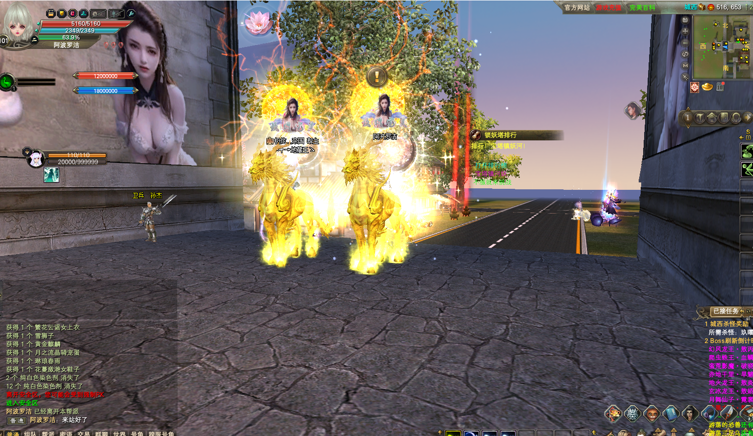 • 城西門外有大量怪物,秒升100級(jí)掉落龍珠、幻仙、裝備材料等
