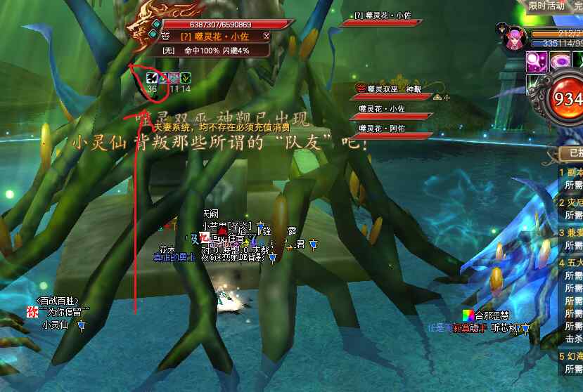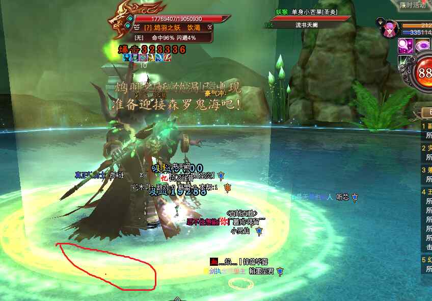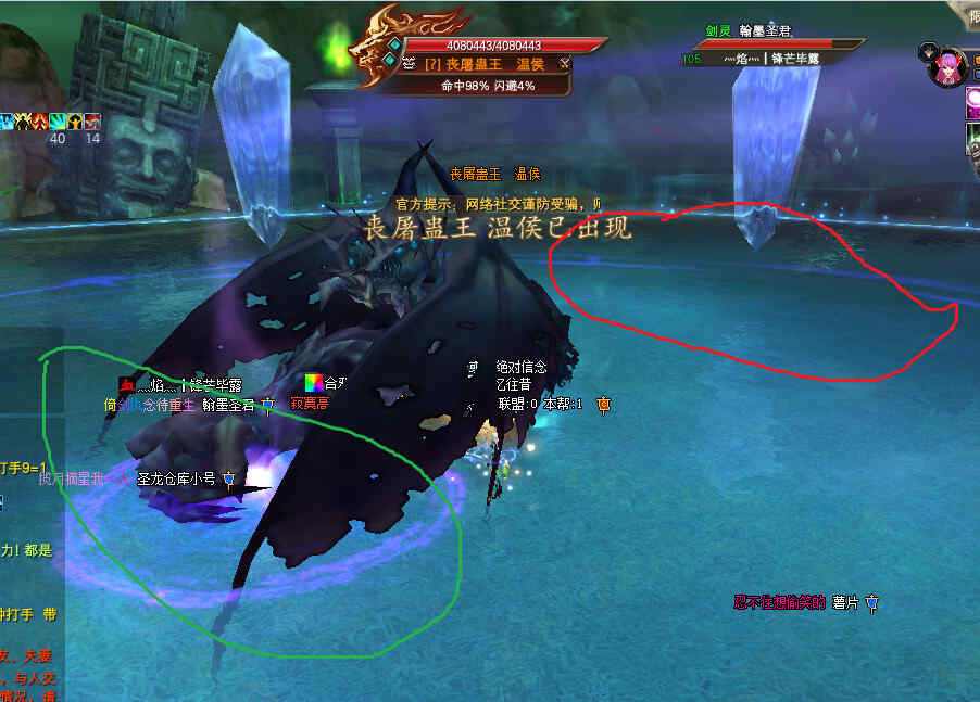 注意事項(xiàng),BB出來后,誰第一個(gè)打它,它就給第一仇恨釋放一個(gè)小紫色圈,如圖片我綠色標(biāo)記所示。紫圈持續(xù)高傷害,需要跑出來,