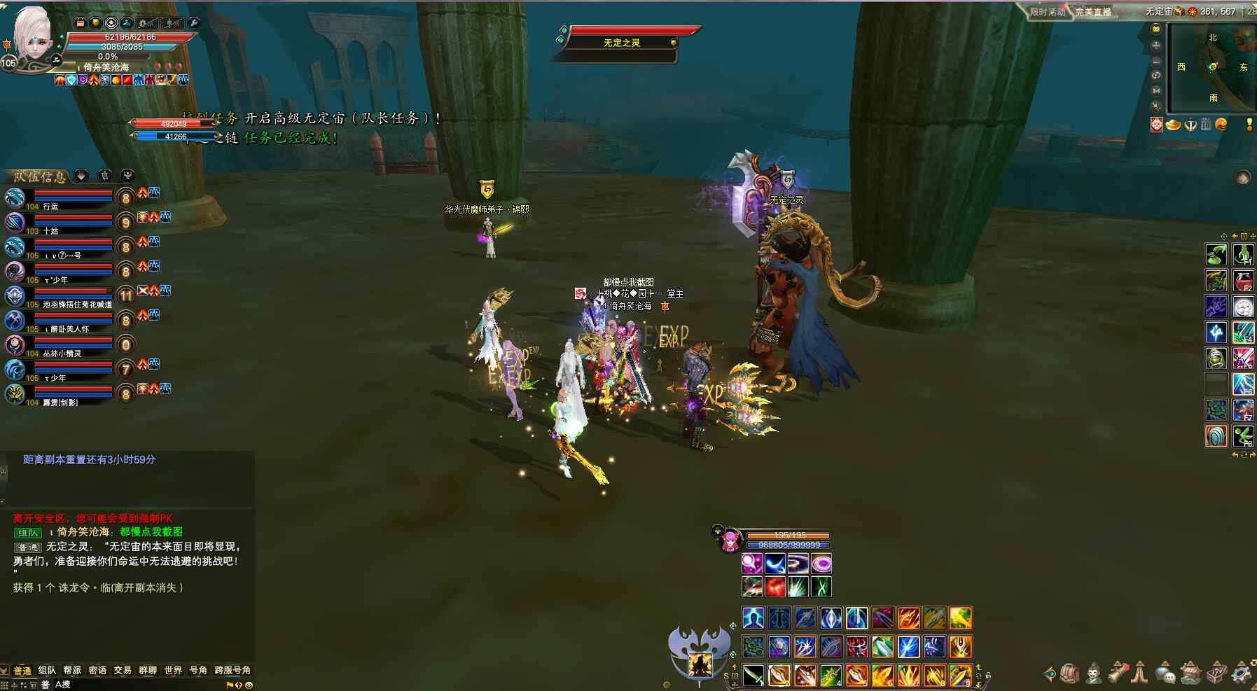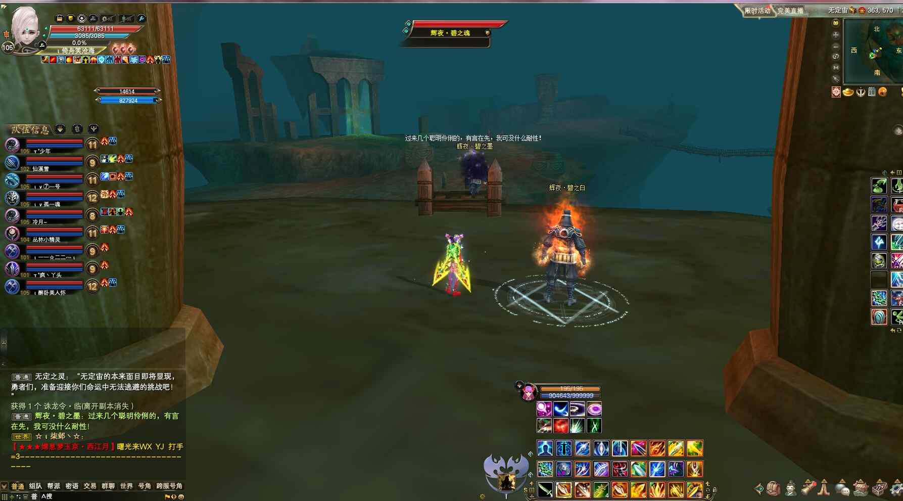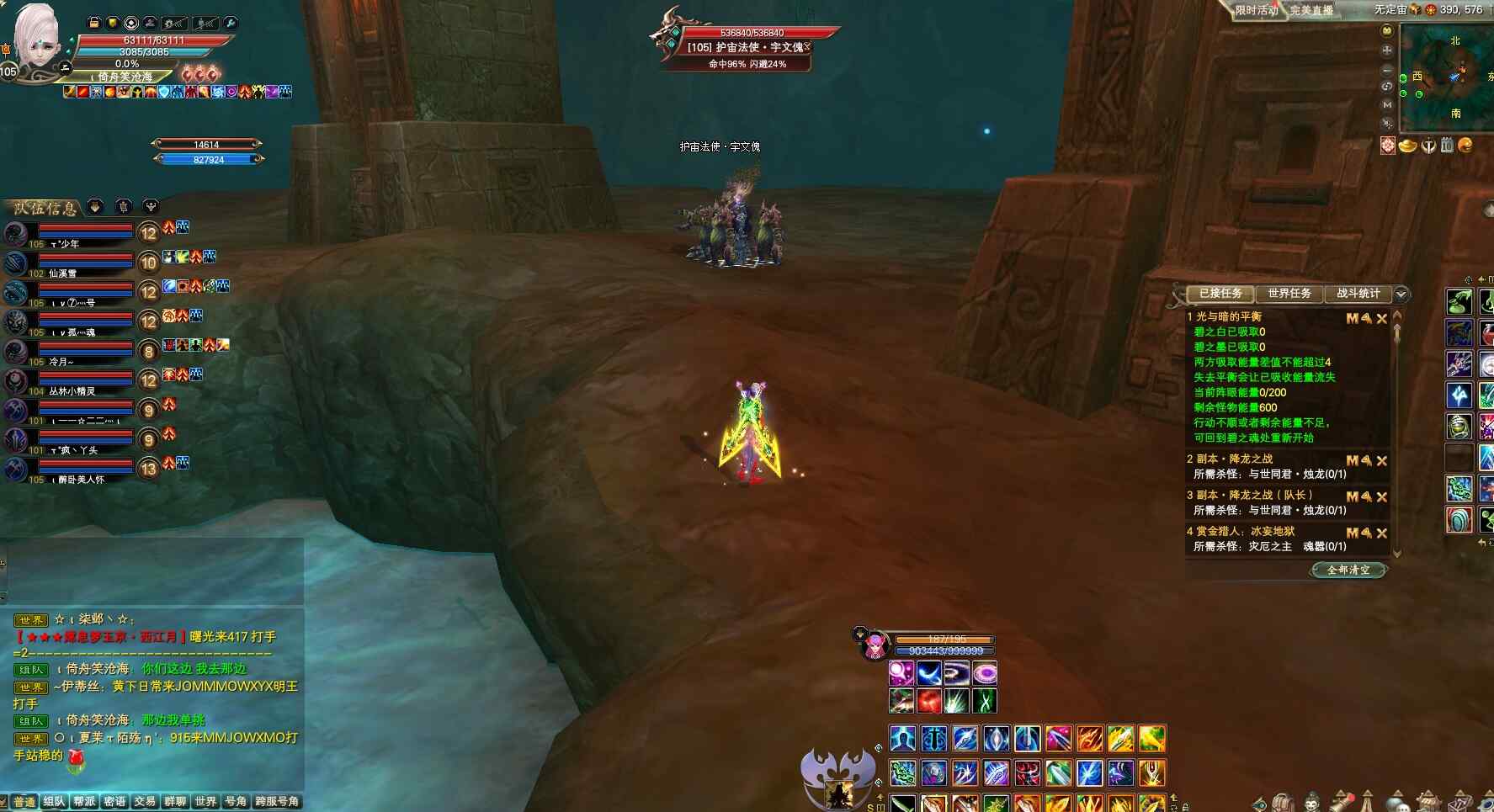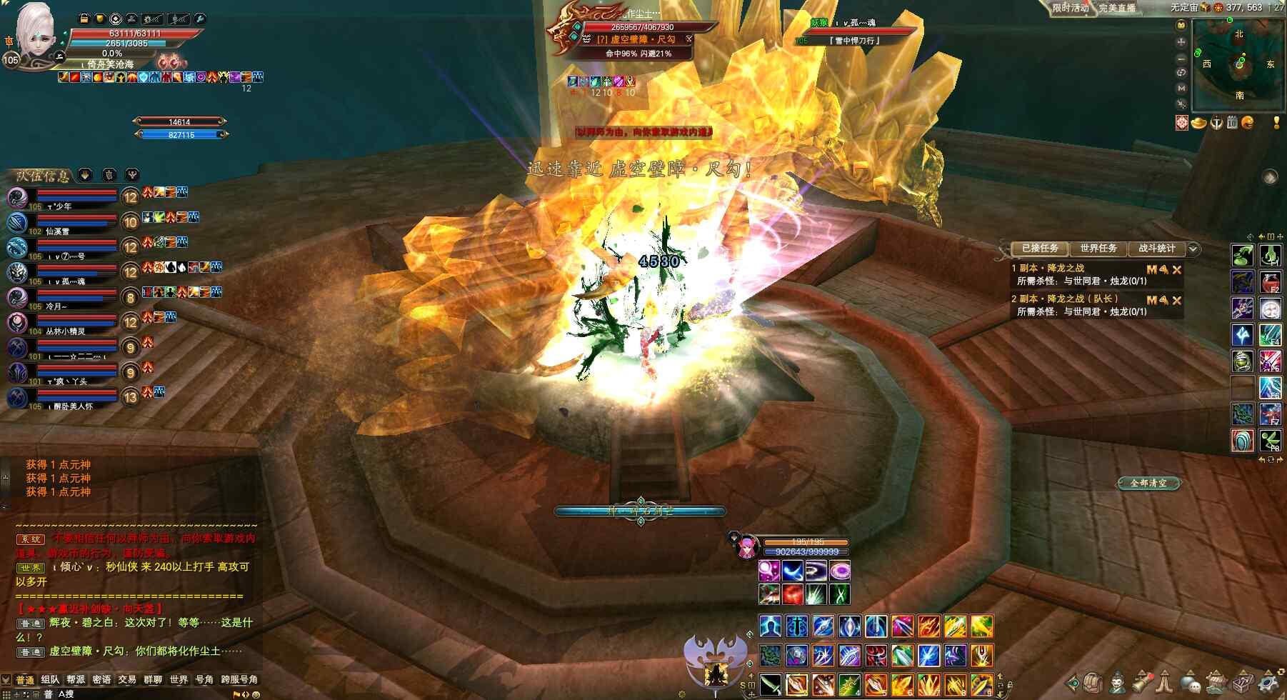 然后跟隨碧藍(lán)姬之影,去打虛空壁障.尺勾,到位置首先逐個(gè)擊殺五行結(jié)界直到BOSS出現(xiàn)、戰(zhàn)斗中途有小怪干擾一并群掉,輝夜.碧之白喊話“這次對了!等等………這是什么?”虛空壁障.尺勾就會(huì)出現(xiàn),注意近身BOSS站位,第一次擊殺虛空壁障.尺勾,會(huì)獲得永久稱號(hào)“平衡大師”。注:擊殺虛空壁障.尺勾后,還有中毒狀態(tài)及時(shí)爆元無敵解毒,否則血少玩家會(huì)給秒殺。戰(zhàn)斗結(jié)束,提示與世同君.燭龍出現(xiàn)在無定宙下方。