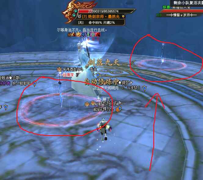 召喚2把劍,劍的下面會有紅圈提示,如下圖紅圈標記所示。需要立刻跑出紅圈范圍,否則被秒。這是第一次劍落九天。