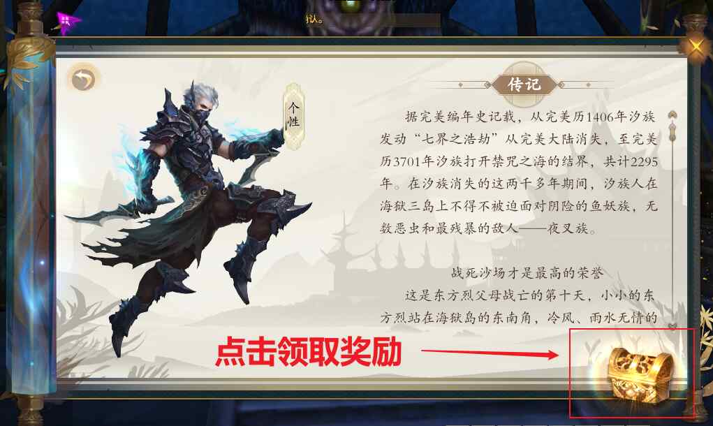 通過界面右下角的“完美英雄志”圖標進入,找到“刺客·東方烈”,點擊進入。然后點擊圖片中的寶箱,就能領取獎勵。