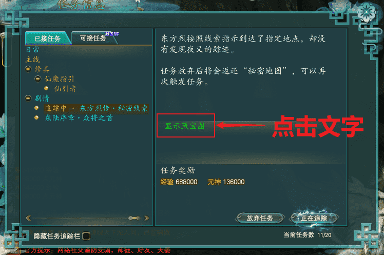 使用鍵盤Q鍵位,調(diào)出任務信息。 可以看到任務的詳細介紹。點擊“顯示藏寶圖”文字,會顯示一張藏寶圖。
