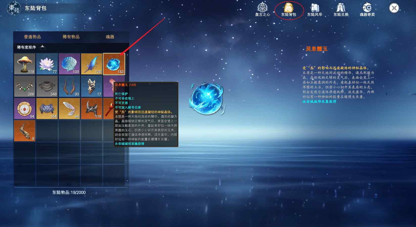 如圖所示,可以看到靈息髓玉有143個(gè)。