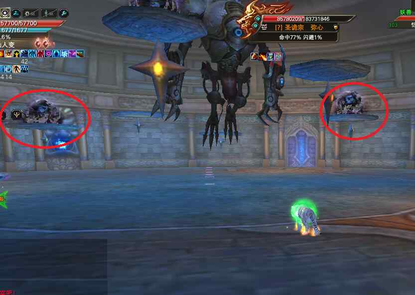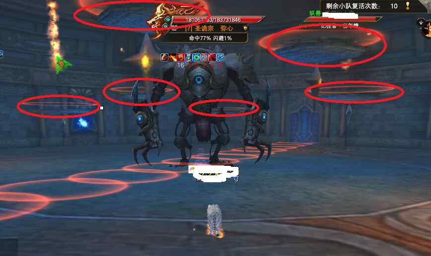 當BB血量打到600W左右,BB免疫傷害,同時在東南西北四個方向出4個小怪,如下圖紅圈標記所示,