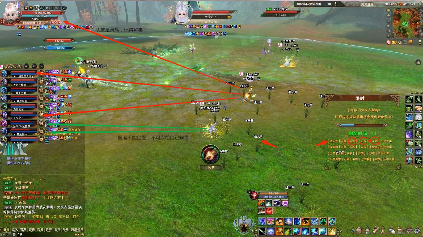 1.站位:按①②③④分區(qū)站位,每個(gè)區(qū)域站2-3人、10人由隊(duì)長安排,正常一個(gè)玩家可以挖草給四個(gè)職業(yè)解毒,技巧就是挖草時(shí)就點(diǎn)到需解毒職業(yè)、提高解毒效率,解錯(cuò)職業(yè)將誤殺隊(duì)友。