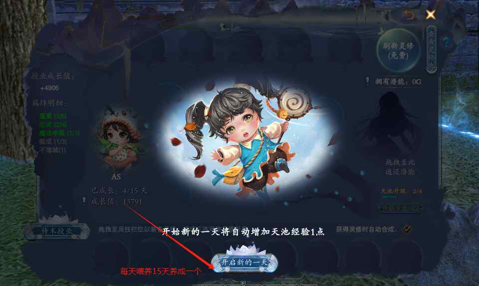 養(yǎng)1個(gè)仙童,需要15天,點(diǎn)開(kāi)右下角的”修行“圖標(biāo),展開(kāi)的第二個(gè)圖就是仙童系統(tǒng)!