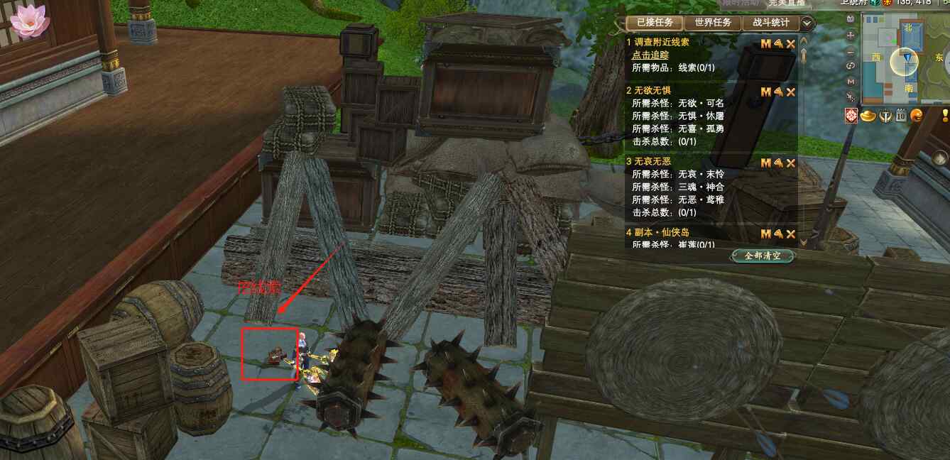 返回衛(wèi)統(tǒng)府,根據(jù)追蹤提示,到(133.418)觸發(fā)任務(wù),在附近(135.418)挖線索。如圖所示,一個小小的物品箱子,不仔細看就錯過了。