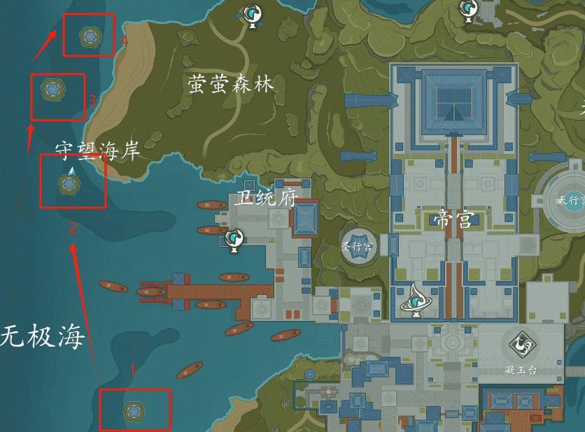 依次點亮后,返回衛(wèi)統(tǒng)府,找水師校尉(130.425)交任務(wù)。接到任務(wù),去無極海(74.409.高度50)放入鎮(zhèn)海神石·金,地圖有追蹤黃圈哦!到了黃圈中央,跳下水即可。放置好金以后,旁邊依次出現(xiàn)土、木、水、火、都放置好后完成任務(wù)。