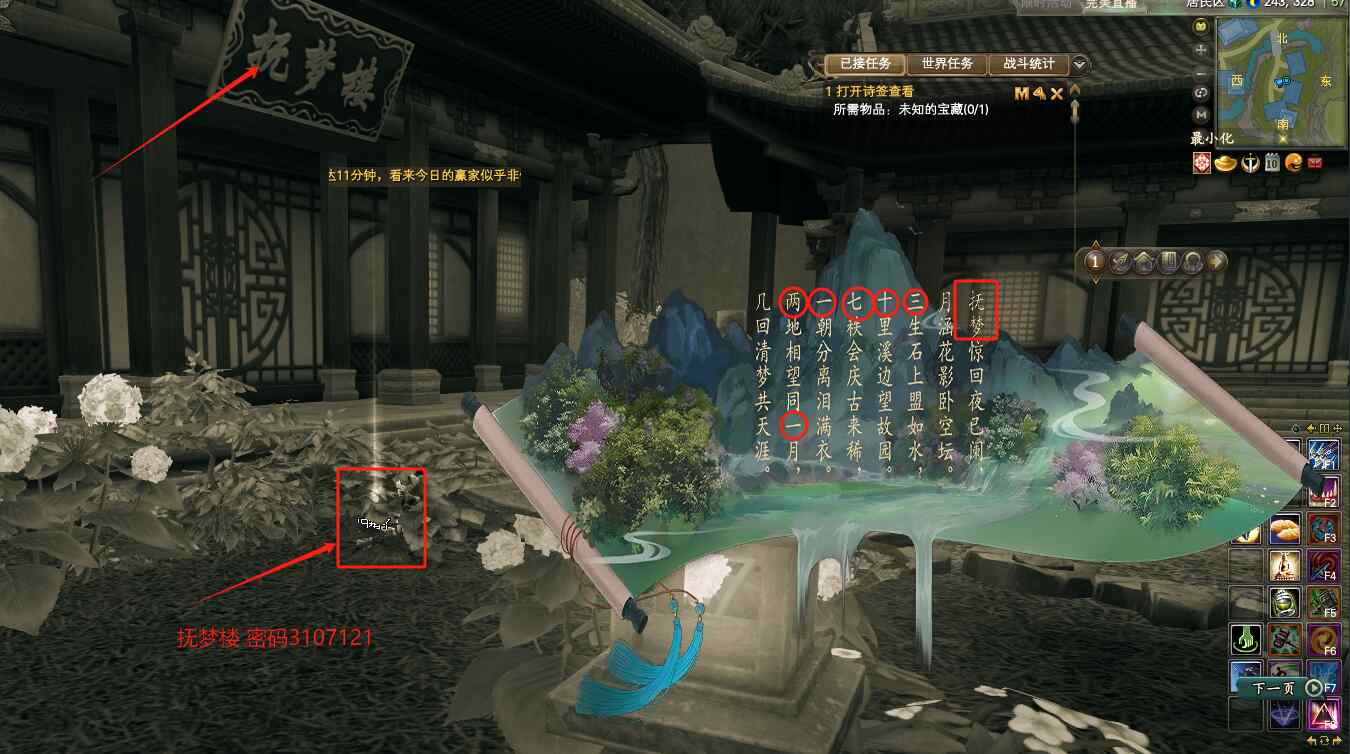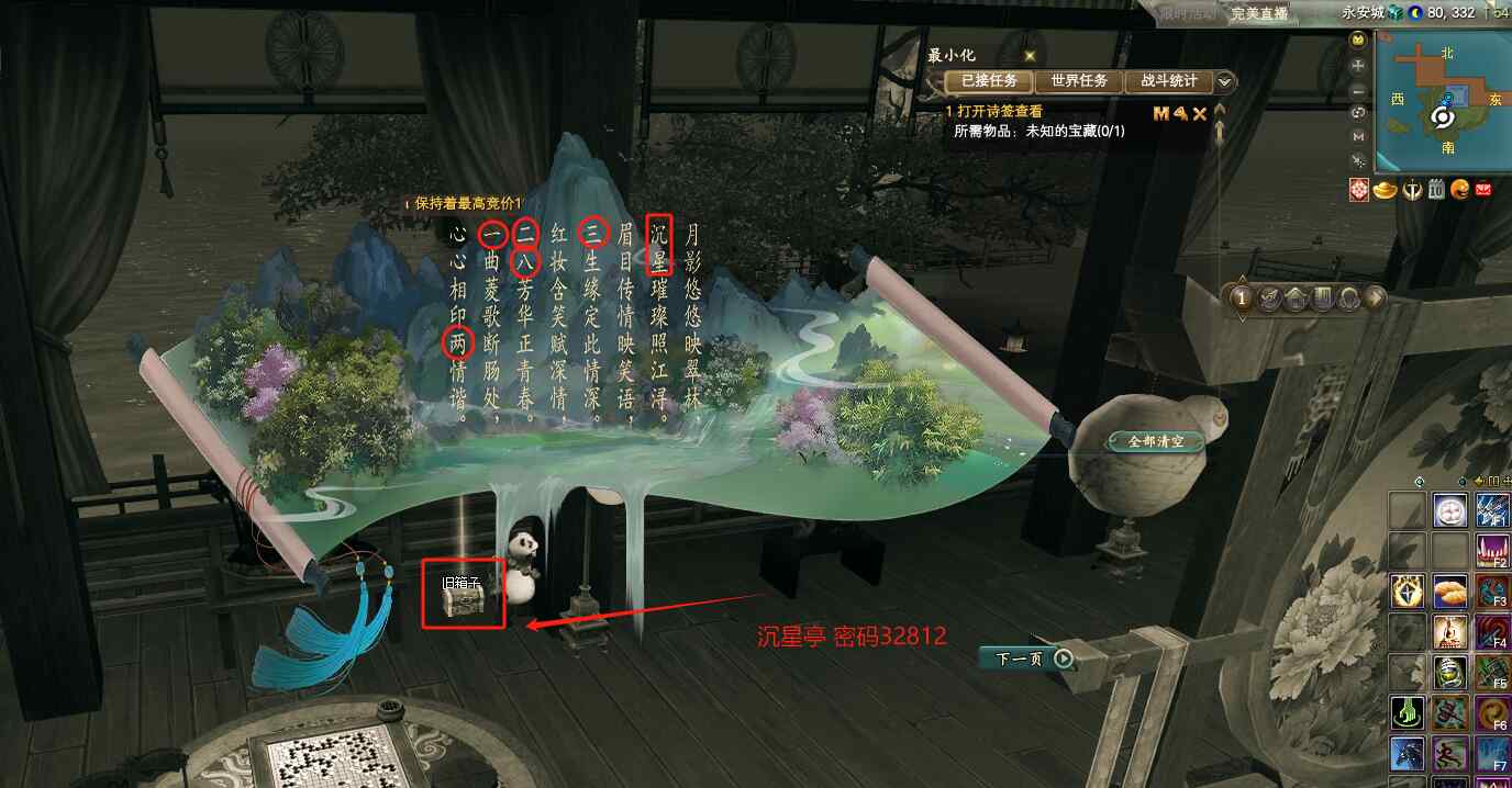 到NPC岳陽處(135.321)接到任務(wù)未知的寶藏,打開包里的詩簽,根據(jù)詩簽我們推斷出,第一個藏寶箱子在重蕊畫舫(205.367.高度54)密碼139哦!