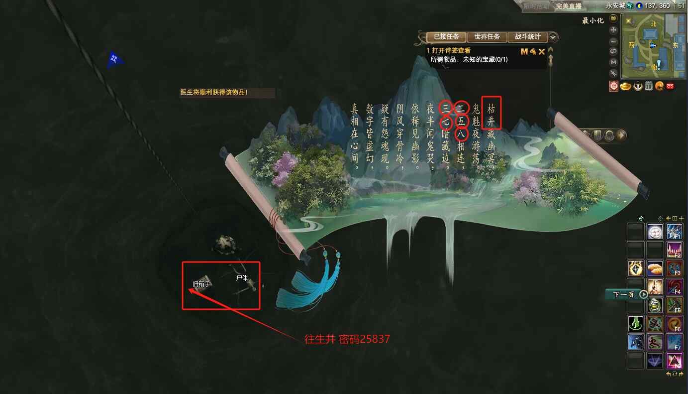 挖取后得到“血帕”,返回曦照山莊找岳陽(135.321)交任務(wù),對話完成后得到第五個詩簽,根據(jù)詩文推斷,第五個箱子在往生井(137.360),跳下去井底哦,密碼是(25837)。