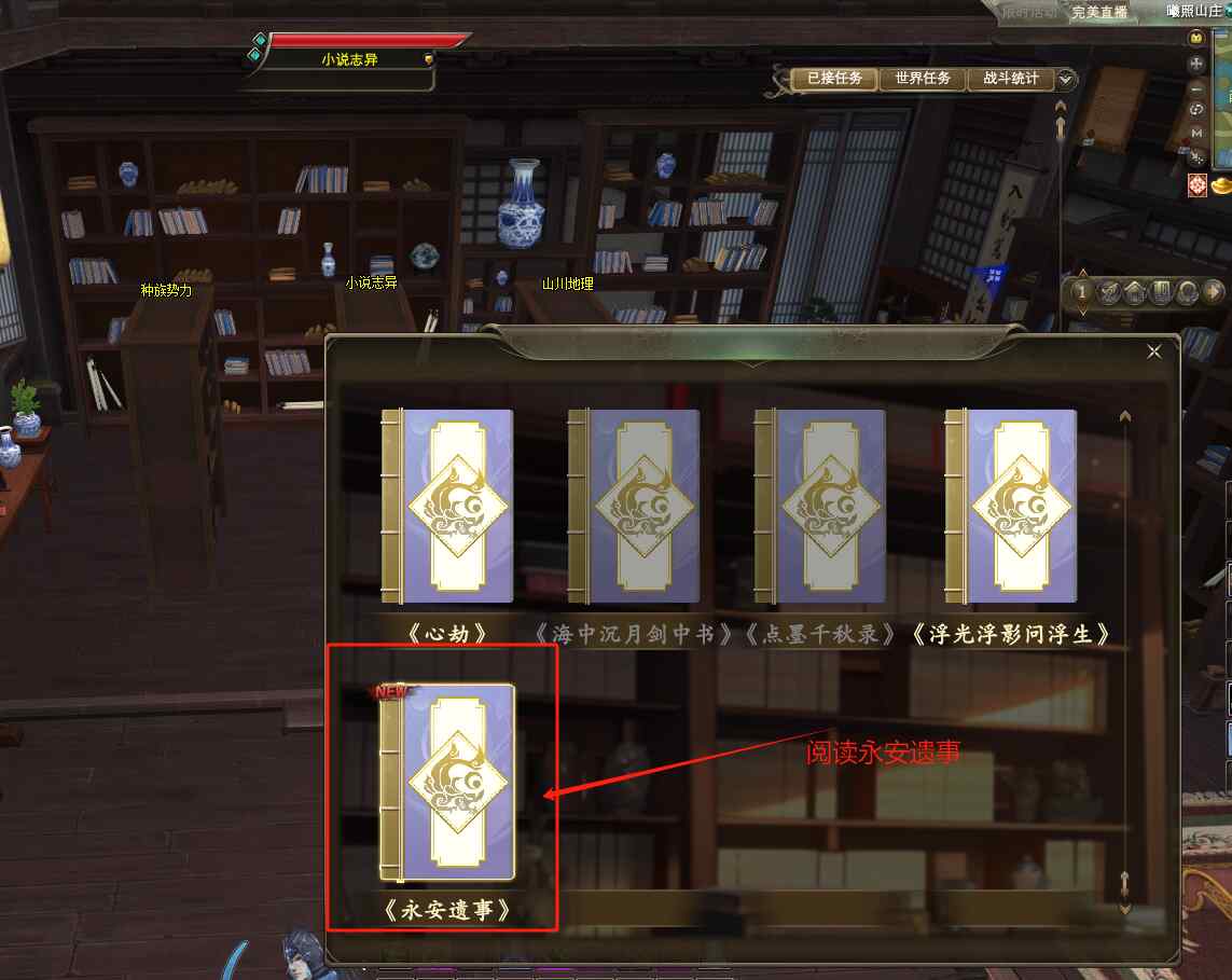 根據(jù)岳陽的提示,去小說志異書架上,閱讀《永安遺事》,開啟后續(xù)奇遇任務(wù)“往日還記否”和“伯仁之死”。