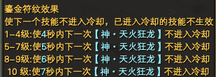 韌位技能,神天火狂龍;通常使用金色或者藍色,金色擁有元氣恢復(fù),副本雙龍WX必備顏色,藍色需要配合神萬劍訣釋放,用于清理眾多小怪做到滿屏暴擊,普通玩家建議使用金色。